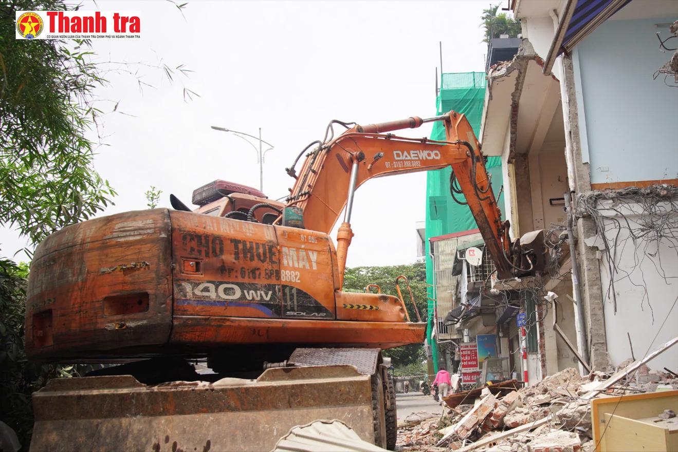 Máy xúc được huy động phá dỡ công trình tại khu vực ngõ 310 Nghi Tàm phục vụ Dự án Cầu Tứ Liên. Ảnh: H.T