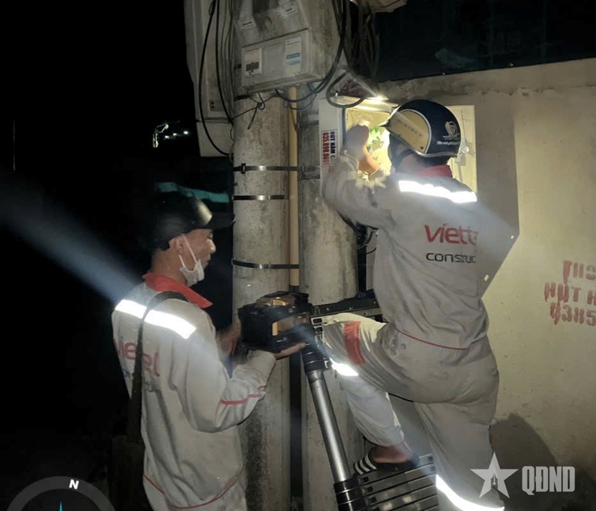 Các nhân viên kỹ thuật Viettel Nghệ An khắc phục sự cố của hệ thống viễn thông. |