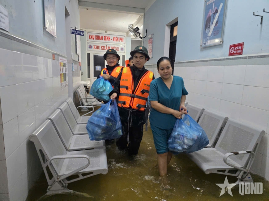 Cùng với đó, bộ đội, dân quân tiếp tục tiếp tế nhu yếu phẩm cho người dân vùng ngập lụt. Ban chỉ huy Phòng thủ khu vực 1 - Hương Trà vượt lũ hỗ trợ hàng trăm suất cơm, nước uống tới y, bác sĩ và bệnh nhân tại Trung tâm Y tế Hương Trà.