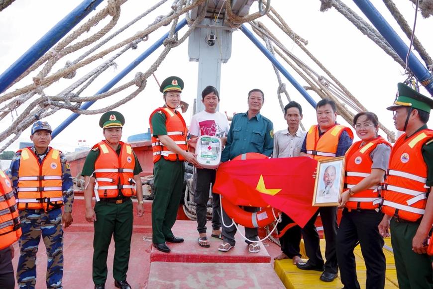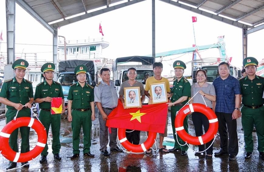 | Bộ đội Biên phòng TP Cần Thơ trao cờ Tổ quốc, ảnh Bác Hồ và phao cứu hộ tặng ngư dân. Ảnh: HIẾU HÀ |