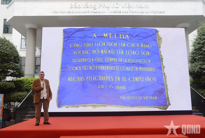 | Bức trướng “A Melba cùng Fidel luôn luôn làm cách mạng với Bác Hồ mãi mãi tấm lòng son” của bà Melba Hernández Rodríguez. |