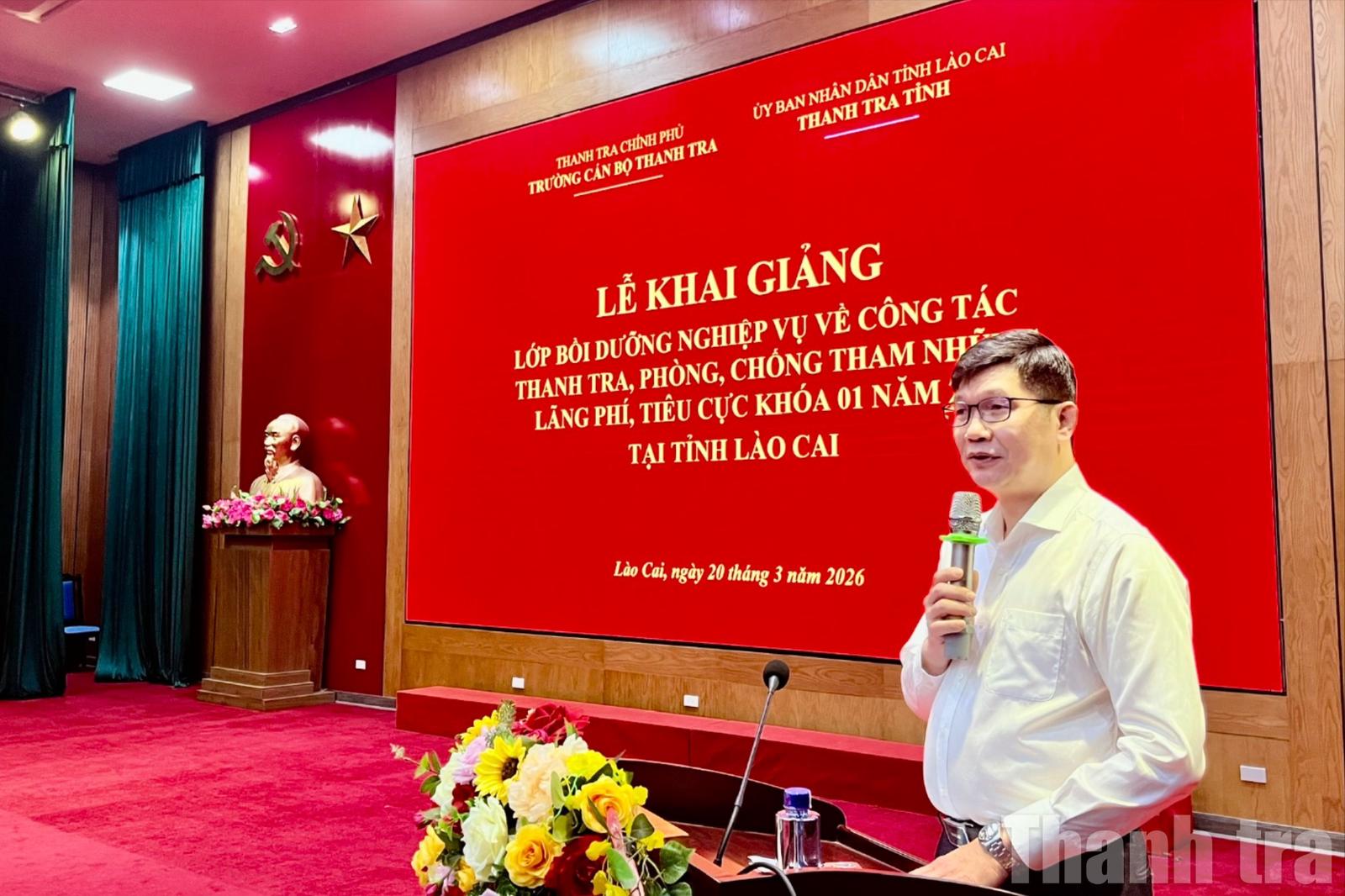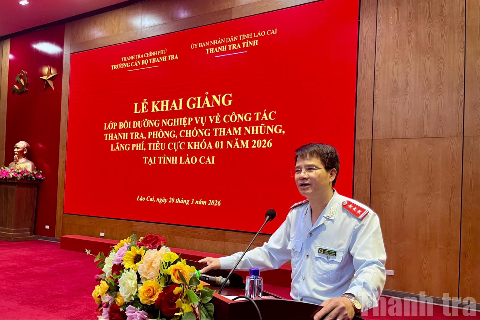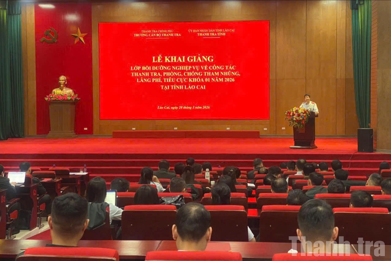 Sáng 20/3, tại tỉnh Lào Cai, Trường Cán bộ Thanh tra (Thanh tra Chính phủ) phối hợp với Thanh tra tỉnh Lào Cai tổ chức Lễ khai giảng lớp bồi dưỡng nghiệp vụ về công tác thanh tra, phòng, chống tham nhũng, lãng phí, tiêu cực khóa 1 năm 2026.