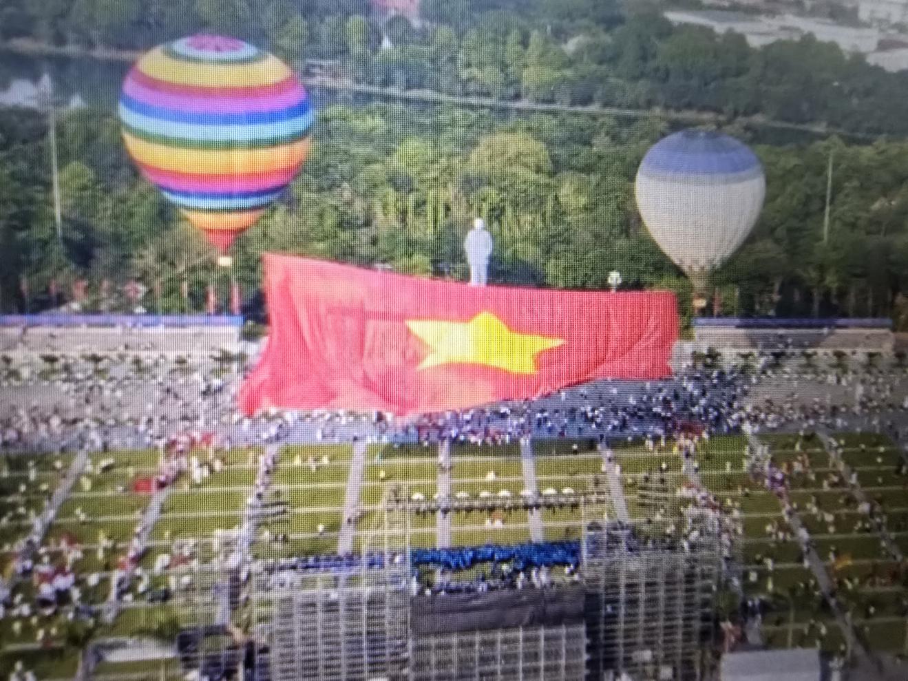 Tại lễ chào cờ, 2 khinh khí cầu mang đại kỳ Tổ quốc có diện tích 2.025m2 cất cánh bay lên bầu trời thành phố Vinh, tạo nên khoảnh khắc thiêng liêng, thể hiện lòng thành kính, niềm tự hào và biết ơn sâu sắc đối với Chủ tịch Hồ Chí Minh - lãnh tụ vĩ đại của dân tộc Việt Nam.