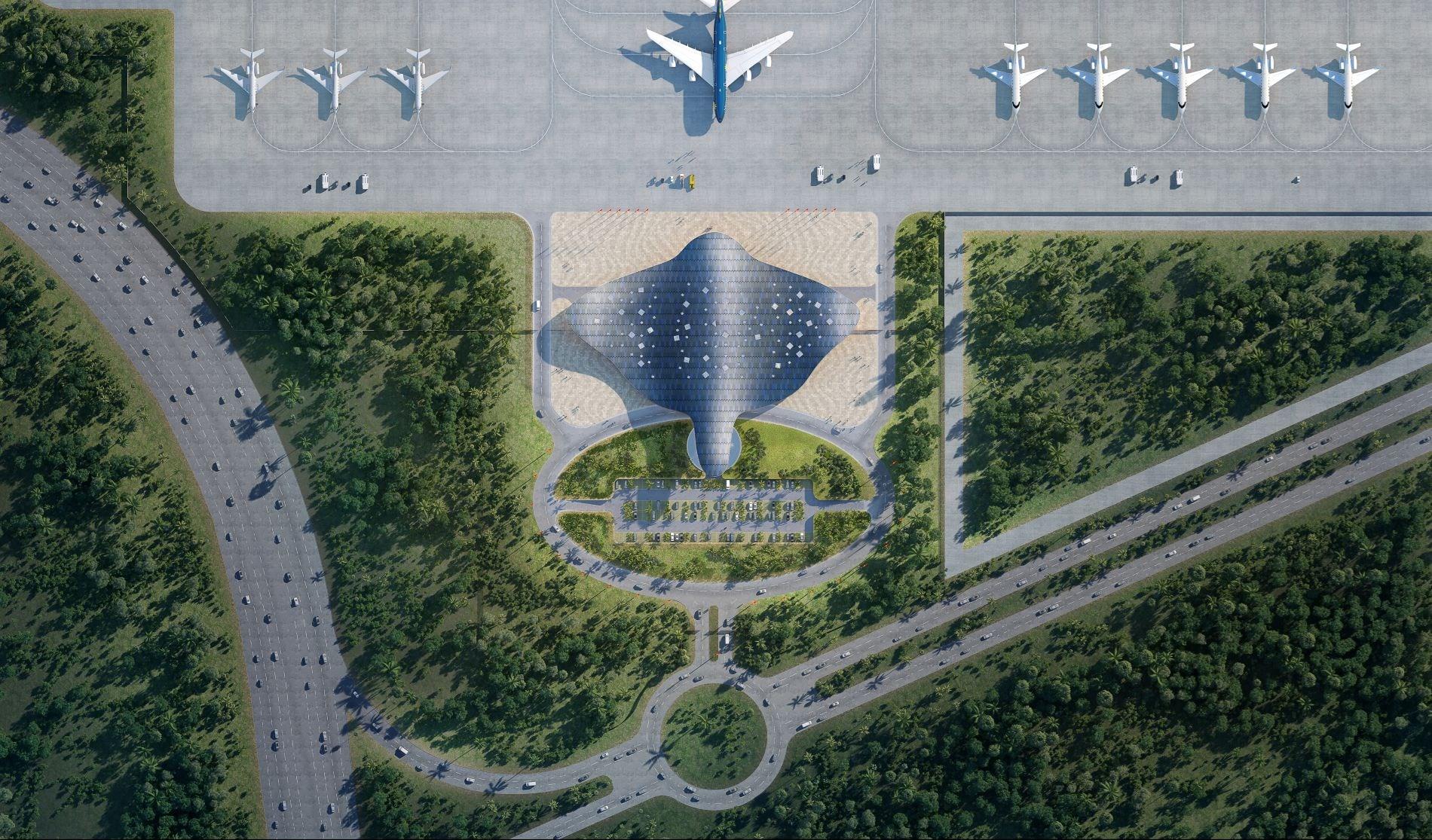 Phối cảnh Cảng hàng không quốc tế Phú Quốc với nhà ga mới lấy cảm hứng từ hình tượng Phượng Hoàng. |