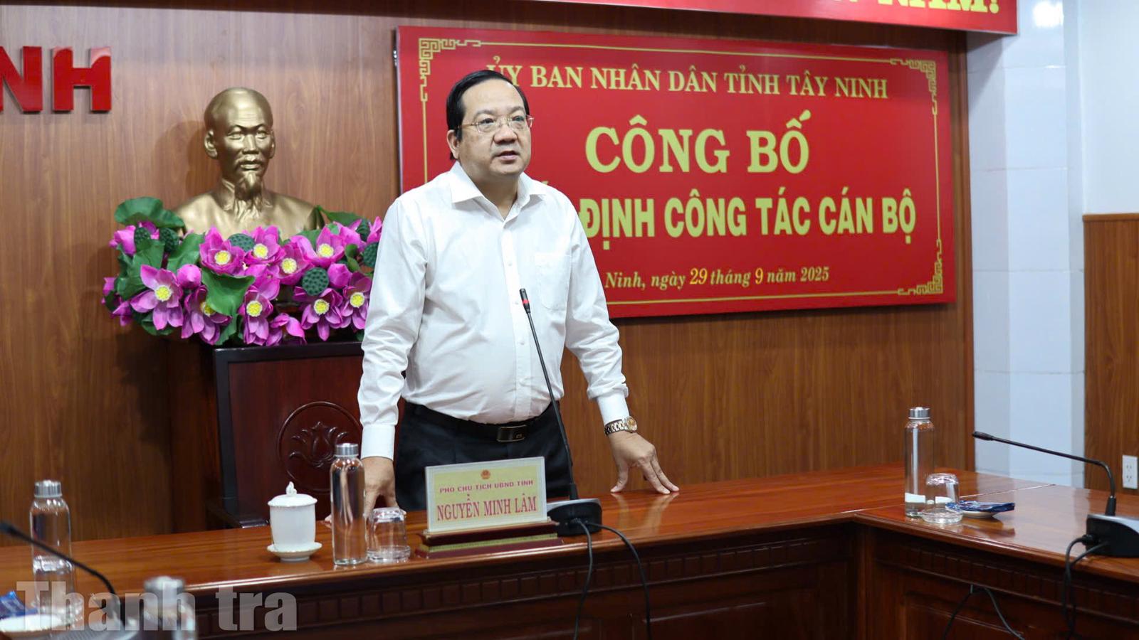 Sáng 29/9, UBND tỉnh Tây Ninh tổ chức Hội nghị công bố và trao các quyết định về công tác cán bộ. Ông Nguyễn Minh Lâm, Ủy viên Ban Thường vụ Tỉnh ủy, Phó Chủ tịch UBND tỉnh chủ trì hội nghị.