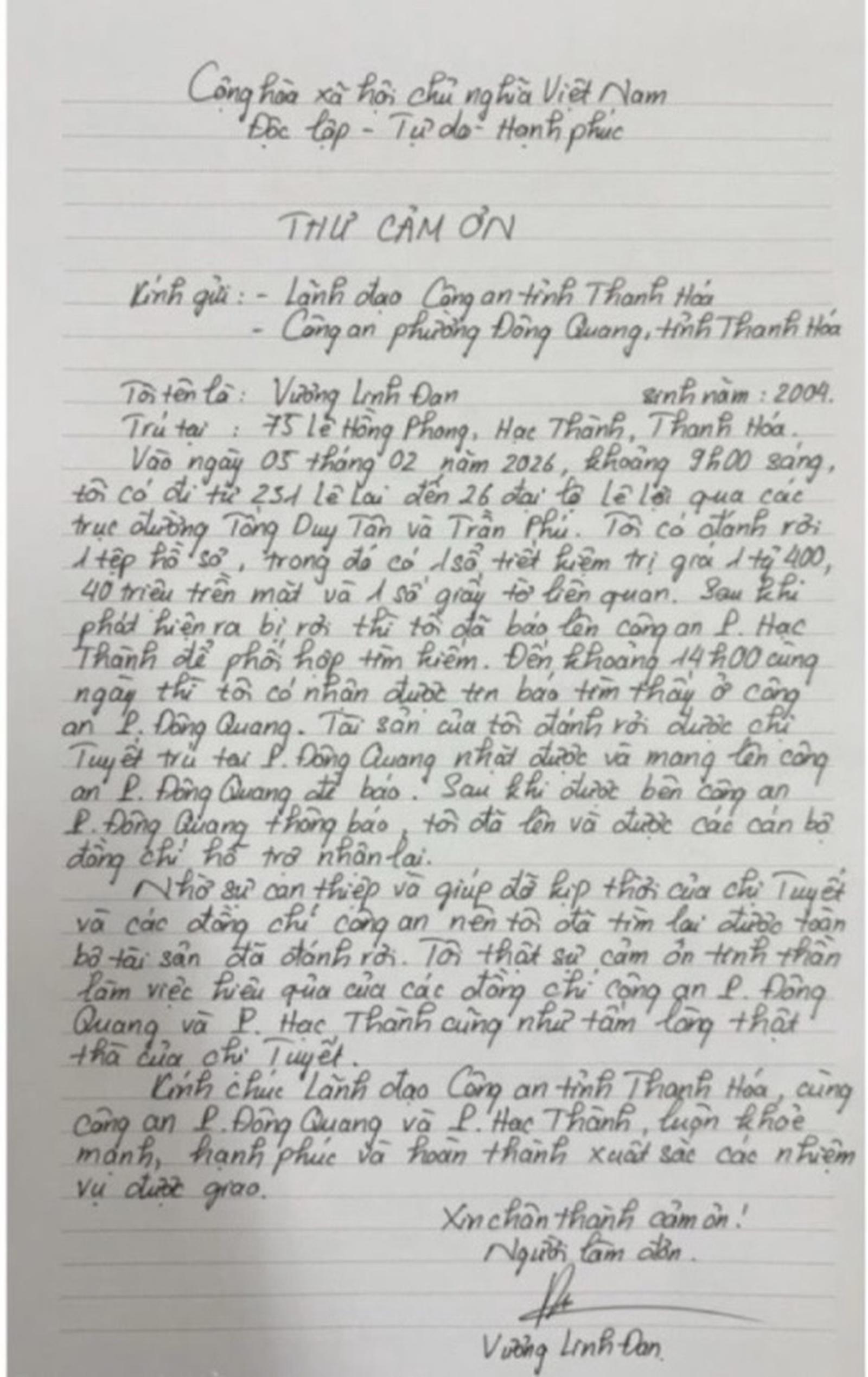 Sau khi nhận lại số tài sản bị đánh rơi, chị Vương Linh Đan đã rất cảm kích, viết thư cảm ơn chị Nguyễn Thị Tuyết và lực lượng Công an.