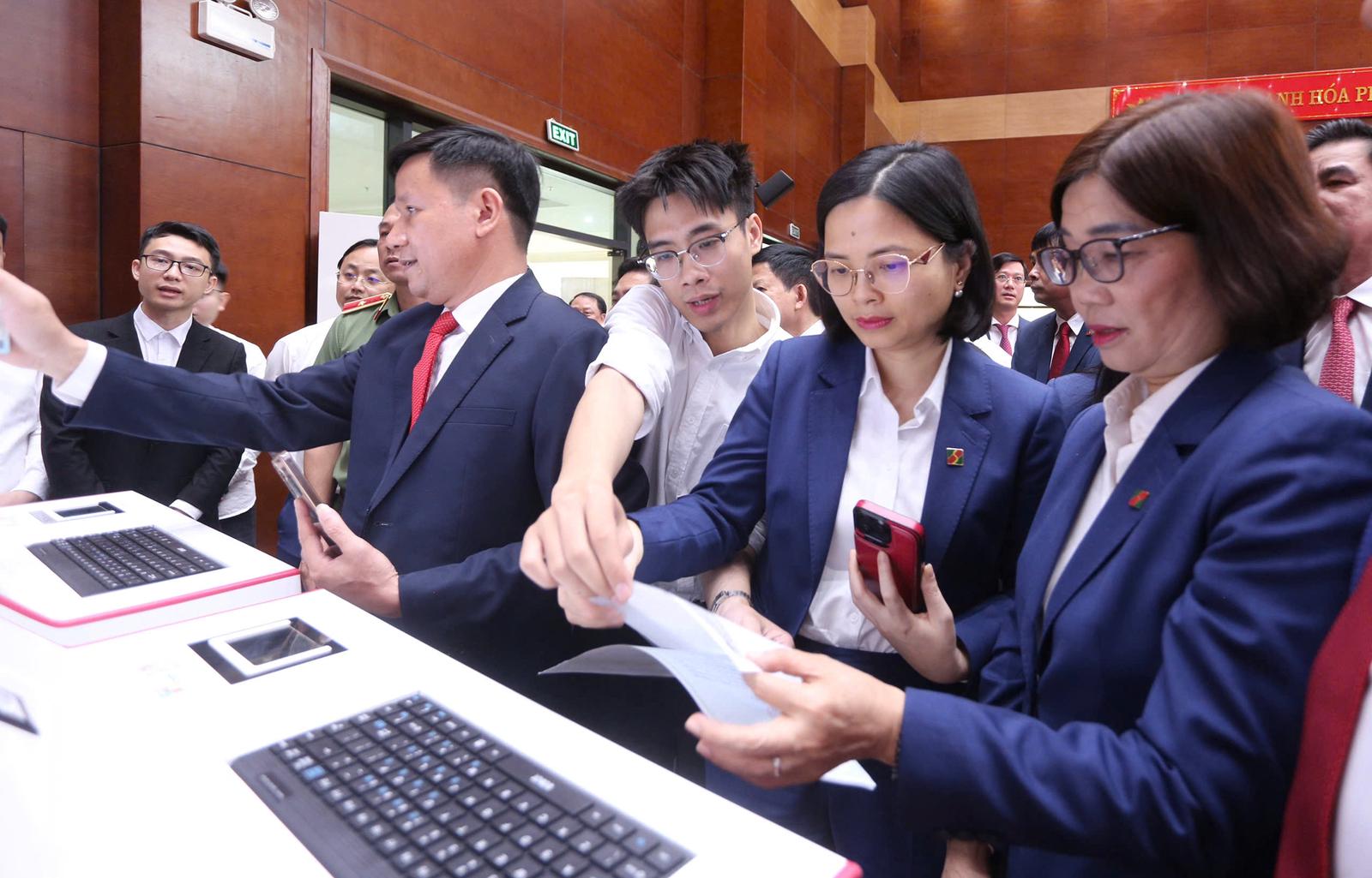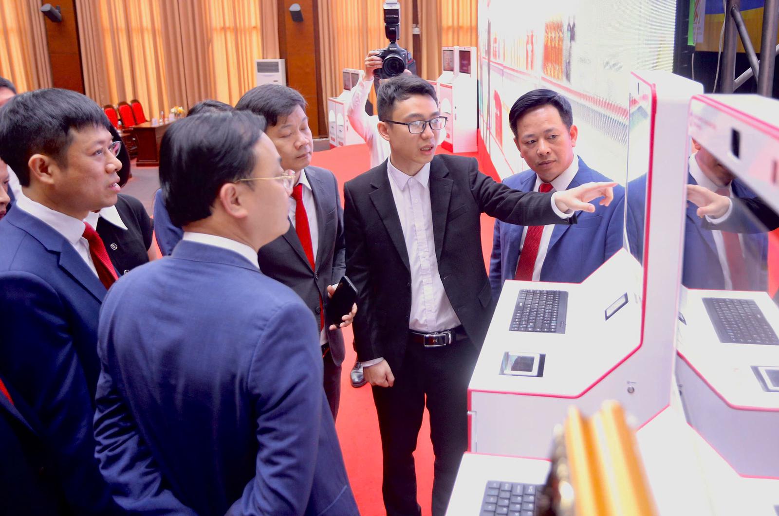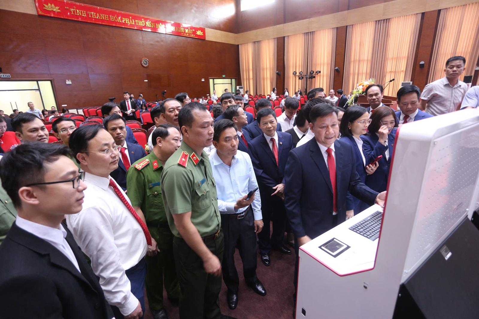 Cán bộ, lãnh đạo Thanh Hóa trải nghiệm hệ thống ki ốt thông minh. Ảnh: Văn Thanh