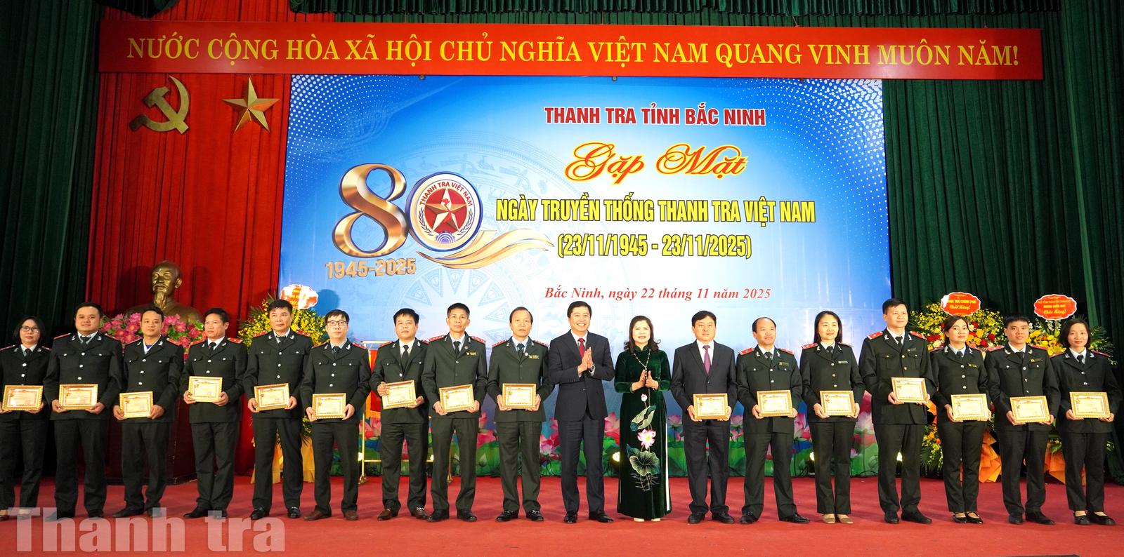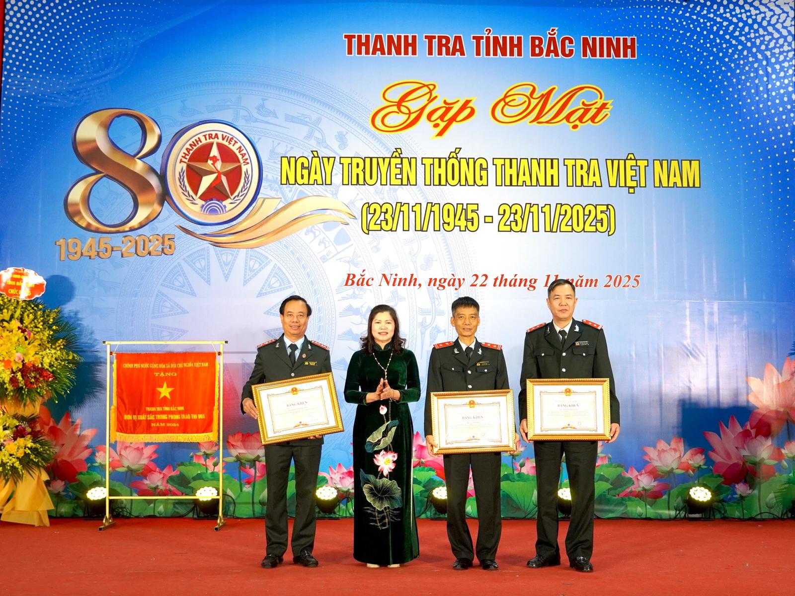 Tại buổi lễ, Thanh tra tỉnh Bắc Ninh vinh dự được Chính phủ tặng Cờ thi đua vì những đóng góp nổi bật trong phong trào thi đua năm 2024. Nhiều cá nhân đã được trao tặng Kỷ niệm chương “Vì sự nghiệp Thanh tra” nhằm ghi nhận quá trình cống hiến lâu dài cho ngành Thanh tra.
