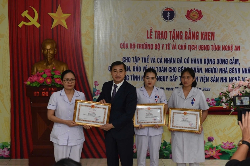| GS, TS Trần Văn Thuấn, Thứ trưởng Bộ Y tế trao Bằng khen của Bộ trưởng Bộ Y tế tặng tập thể Khoa Sơ sinh và 2 điều dưỡng Trần Thị Hồng, Nguyễn Thị Hồng công tác tại Bệnh viện Sản nhi Nghệ An. |