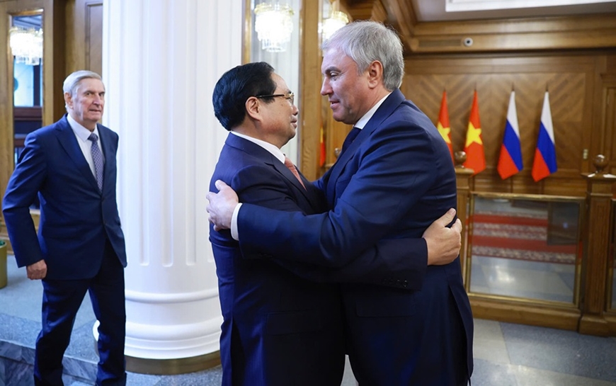 Thủ tướng Chính phủ Phạm Minh Chính đánh giá cao vai trò của Duma Quốc gia Nga và Chủ tịch Vyacheslav Volodin trong việc hoàn thiện khuôn khổ pháp lý, tạo thuận lợi triển khai các thỏa thuận cấp cao, hỗ trợ thực hiện các chương trình, kế hoạch, dự án hợp tác cụ thể, nhằm thúc đẩy và làm sâu sắc hợp tác Việt Nam-Nga, cảm ơn sự quan tâm tạo điều kiện và bảo đảm an ninh của Quốc hội Nga cho cộng đồng người Việt Nam sinh sống, làm ăn và học tập ổn định, hòa nhập vào sở tại, góp phần là cầu nối hữu nghị và hợp tác giữa hai nước, hai dân tộc. Thủ tướng Chính phủ Phạm Minh Chính cũng chúc phía Nga sẽ tổ chức thành công cuộc bầu cử Duma Quốc gia vào tháng 9-2026.