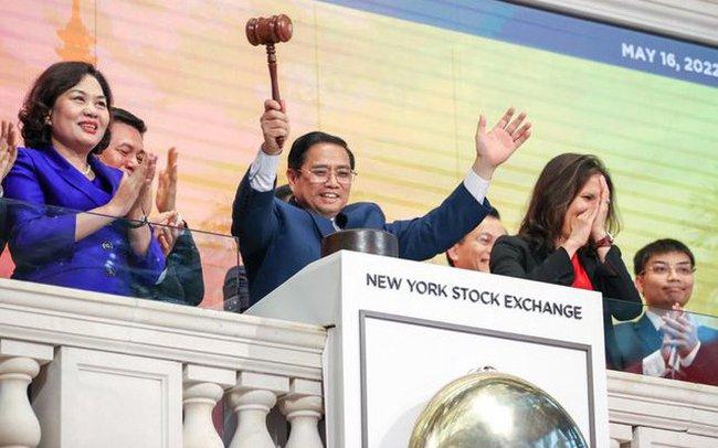 Thủ tướng Phạm Minh Chính bày tỏ niềm vui được tới thăm NYSE, sở giao dịch chứng khoán lớn nhất thế giới về giá trị vốn hóa thị trường và bấm nút rung chuông kết thúc phiên giao dịch.