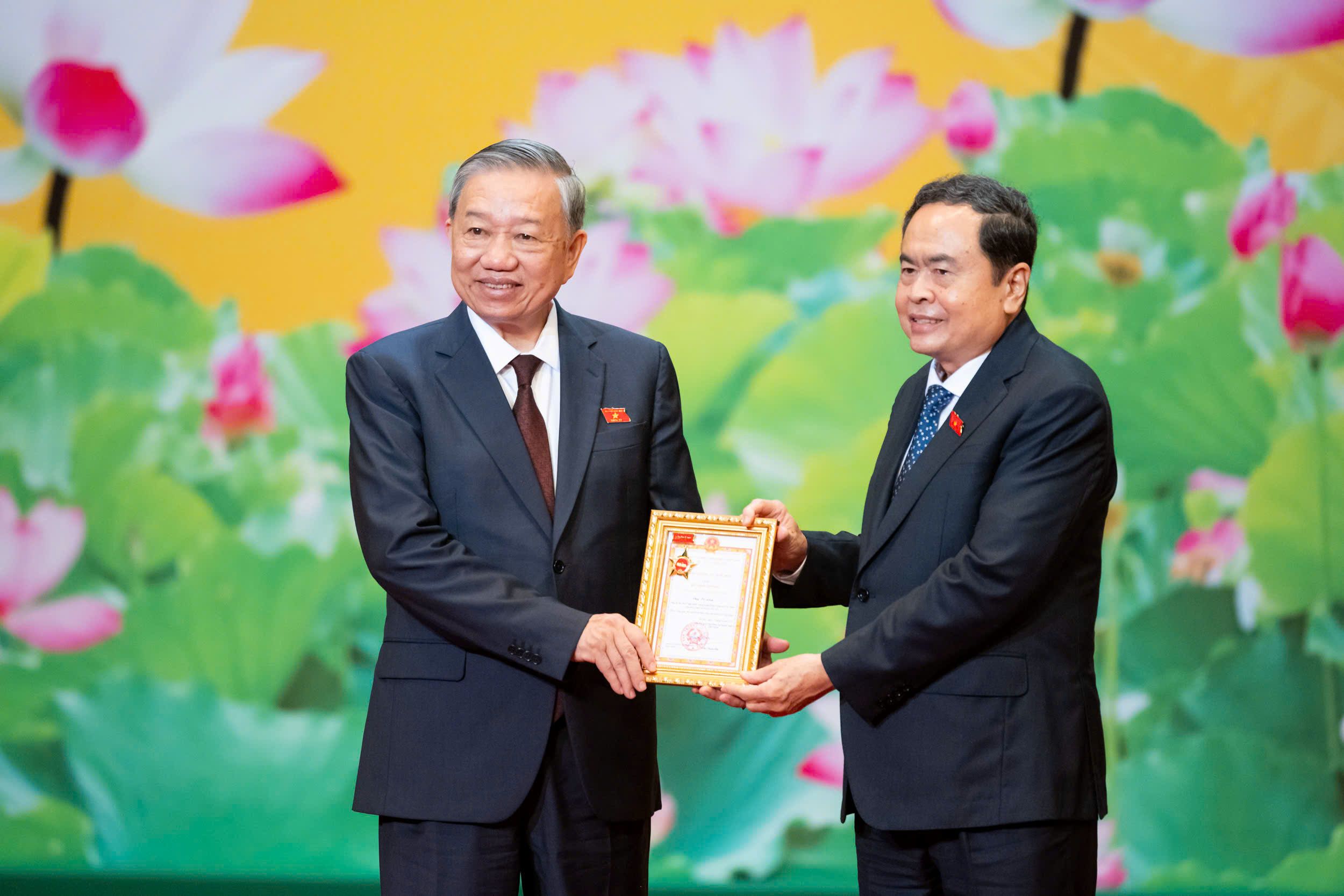 Thay mặt Ủy ban Thường vụ Quốc hội, Chủ tịch Quốc hội Trần Thanh Mẫn trao kỷ niệm chương vì sự nghiệp Quốc hội Việt Nam cho Tổng Bí thư Tô Lâm. Ảnh: P.Thắng