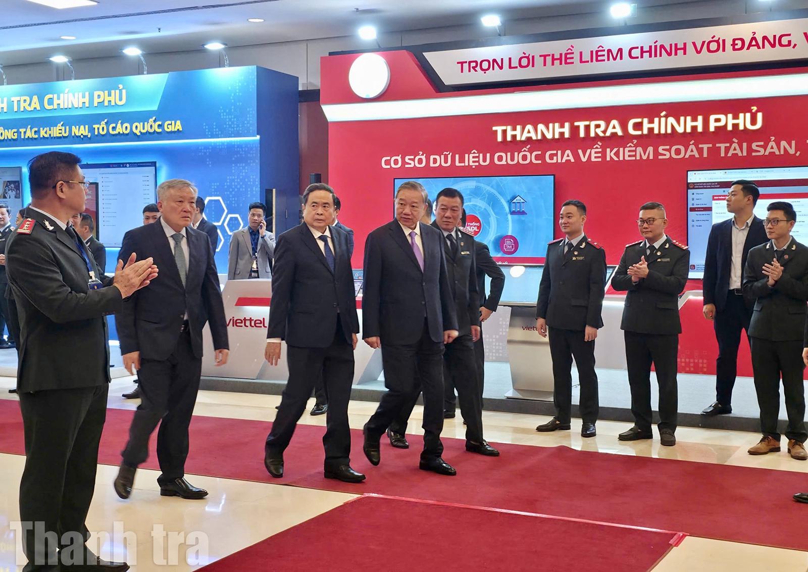 Tổng Bí thư Tô Lâm, Chủ tịch Quốc hội Trần Thanh Mẫn, Phó Thủ tướng Thường trực Chính phủ Nguyễn Hòa Bình, Tổng Thanh tra Chính phủ Đoàn Hồng Phong dự Lễ kỷ niệm 80 năm Ngày truyền thống Thanh tra Việt Nam. Ảnh: Minh Nguyệt