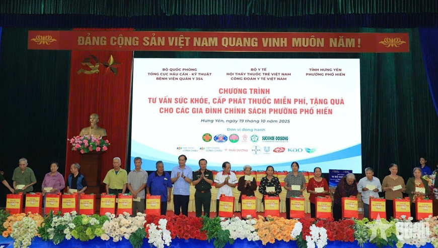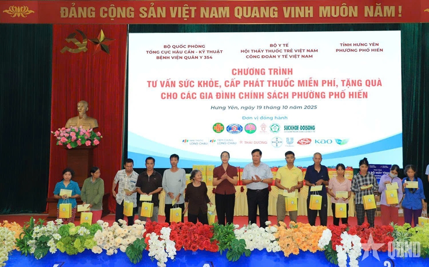 Ngày 19-10, tại tỉnh Hưng Yên, Tổng cục Hậu cần - Kỹ thuật phối hợp với Bộ Y tế và cấp ủy, chính quyền, Mặt trận Tổ quốc, các ban, ngành, đoàn thể địa phương tổ chức chương trình khám bệnh, tư vấn sức khỏe, cấp thuốc miễn phí và tặng quà các gia đình chính sách phường Phố Hiến.