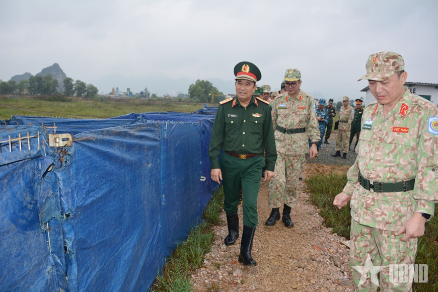 Thượng tướng Phùng Sĩ Tấn kiểm tra hệ thống thao trường, khu vực bố trí lực lượng tham gia diễn tập. |