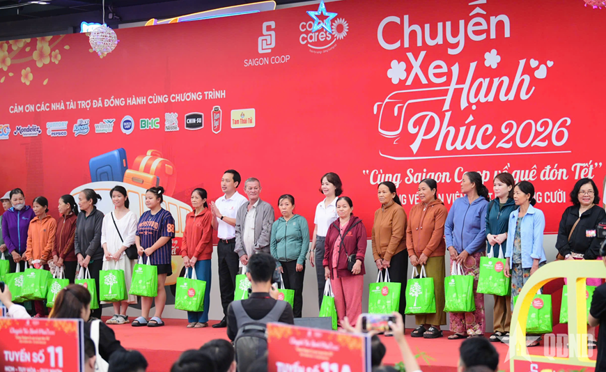 * Sáng cùng ngày, Liên hiệp Hợp tác xã thương mại TP Hồ Chí Minh (Saigon Co.op) chính thức khởi hành chương trình “Chuyến xe hạnh phúc – Cùng Saigon Co.op về quê đón Tết” mùa thứ tư. Theo đó, 20 chuyến xe sẽ đưa 900 người lao động về các tỉnh khu vực Tây Nguyên, Nam Trung Bộ và Bắc Trung Bộ. Saigon Co.op còn chăm lo quà Tết, chi phí ăn uống trong suốt chặng đường về đến địa phương.