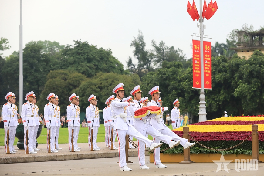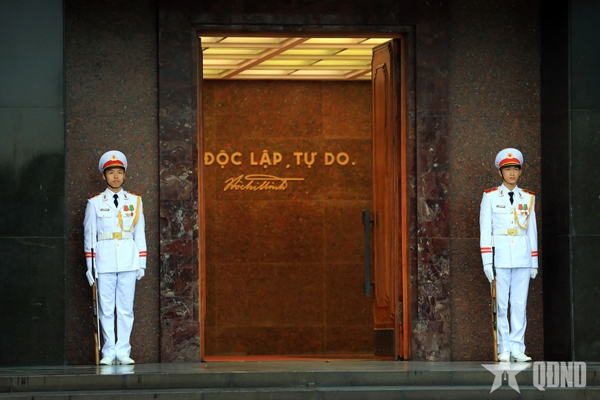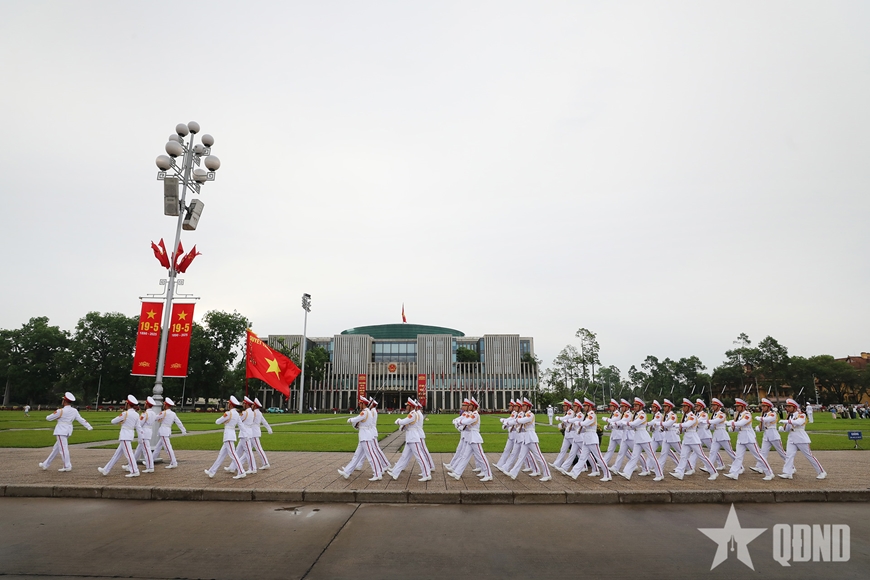 Ngày mới bắt đầu trên Quảng trường Ba Đình. Đúng 5 giờ 50 phút sáng, Đoàn thượng cờ trang nghiêm diễu binh theo đội hình từ bên phải Lăng Chủ tịch Hồ Chí Minh ra trước cột cờ trong tiếng quân nhạc hào hùng của hành khúc “Tiến bước dưới quân kỳ”.