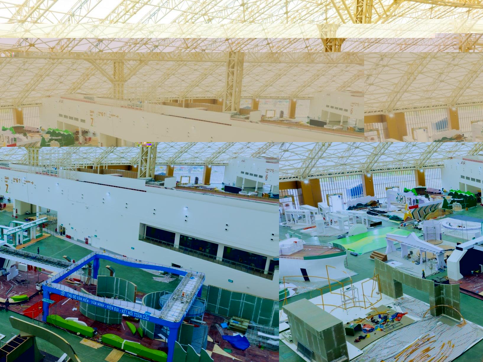 Khu vực trong nhà được kết nối liên thông với khu vực ngoài trời. Với 4 khu vực ở 4 phía Đông-Tây-Nam-Bắc, triển lãm ngoài trời được thiết kế nhằm đáp ứng linh hoạt cho các hoạt động quy mô lớn, chương trình biểu diễn và những sự kiện đặc biệt. Theo bà Lý Hoa Liên, Phó tổng giám đốc Công ty Cổ phần Trung tâm Hội chợ triển lãm Việt Nam: Đội ngũ thực hiện dự án luôn thể hiện tinh thần đồng lòng vì mục tiêu chung. Hàng nghìn công nhân trên công trường nỗ lực đáp ứng tiến độ, thi công 3 ca mỗi ngày cũng như bảo đảm những yêu cầu về chất lượng, kỹ thuật, thẩm mỹ của công trình.