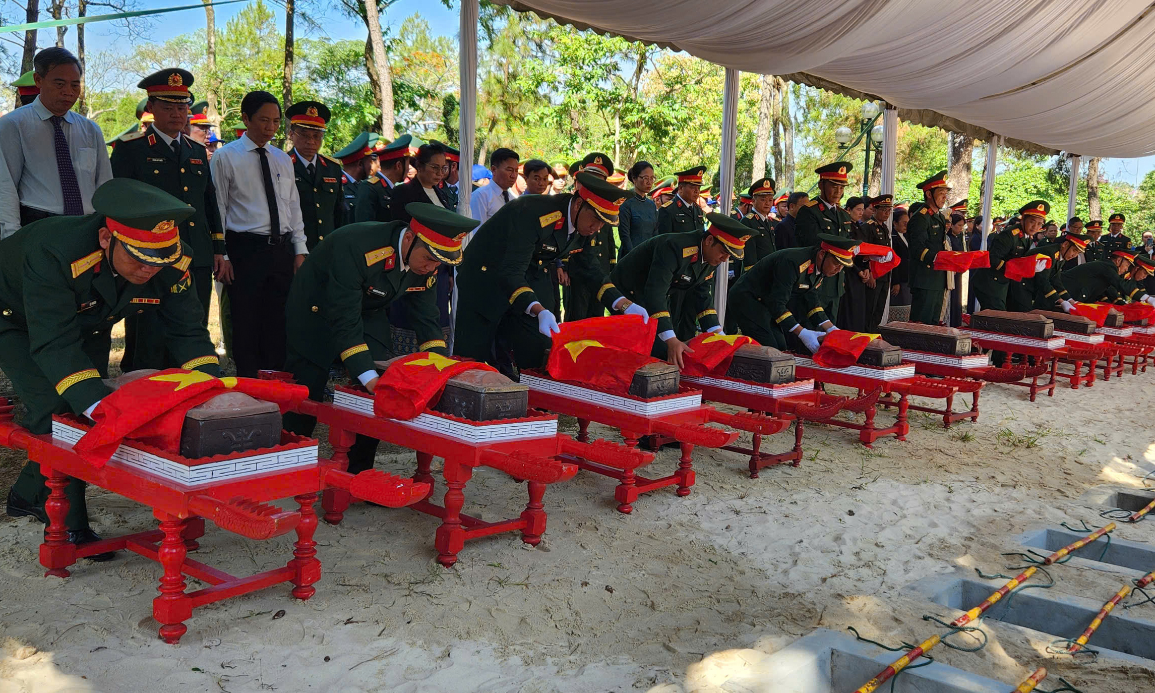 12 hài cốt liệt sĩ quân tình nguyện và chuyên gia Việt Nam hy sinh tại tỉnh Savannakhet được đưa về an táng tại Nghĩa trang Liệt sĩ Quốc gia Đường 9. Ảnh: Minh Tân