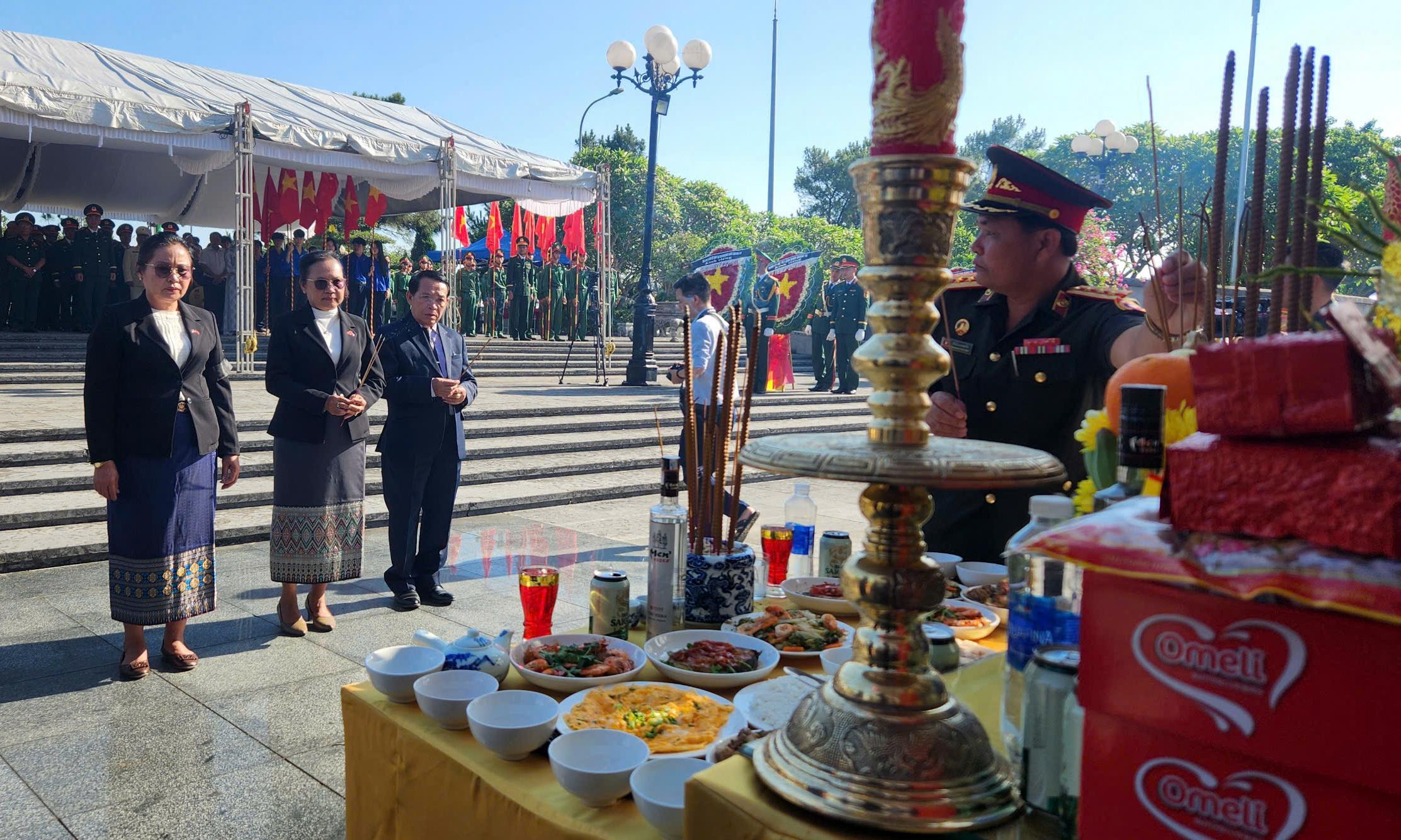 Các đại biểu tỉnh Savannakhet thành kính dâng hương các Anh hùng liệt sĩ. Ảnh: Minh Tân