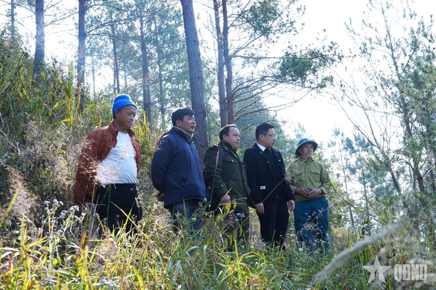 Lãnh đạo xã Sơn Vĩ, tỉnh Tuyên Quang cùng các lực lượng kiểm tra thực địa, chủ động phòng, chống cháy rừng tại khu vực trọng điểm. |