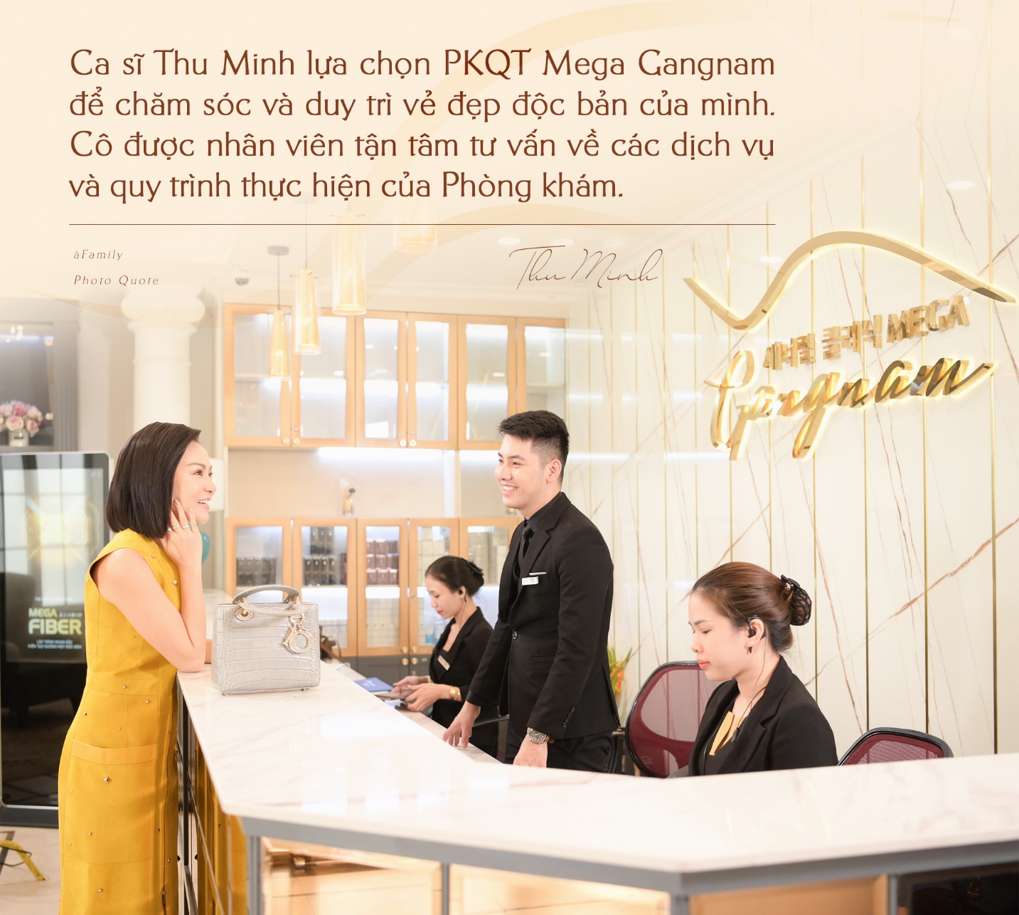 Qua một thời gian dài gắn bó và trở thành khách hàng thân thiết, ca sĩ Thu Minh cho biết rất tin tưởng PKQT Mega Gangnam. Đối với nữ diva, Mega Gangnam là người bạn đồng hành lý tưởng cho tất cả những ai muốn giữ gìn, nâng niu vẻ đẹp độc bản.