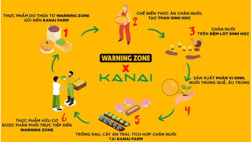 Thông qua vòng tuần hoàn xử lý thực phẩm dư thừa từ Warning Zone gửi đến Kanai Farm để chế biến thức ăn chăn nuôi tạo than sinh học, dùng than chăn nuôi trên đệm lót sinh học, từ đó sản xuất phân vi sinh để trồng rau. Toàn bộ thực phẩm hữu cơ sẽ được phân phối trực tiếp đến Warning Zone. Đây chính là quy trình tích hợp nuôi trồng và xử lý thực phẩm dư thừa an toàn và có hiệu quả.