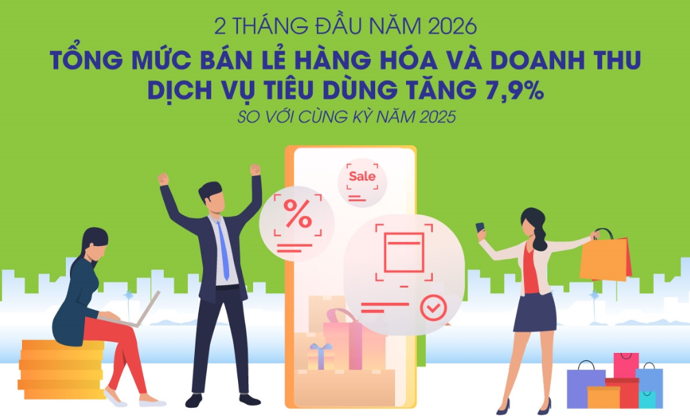 2 tháng đầu năm 2026: Tổng mức bán lẻ hàng hóa và doanh thu dịch vụ tiêu dùng tăng 7,9%