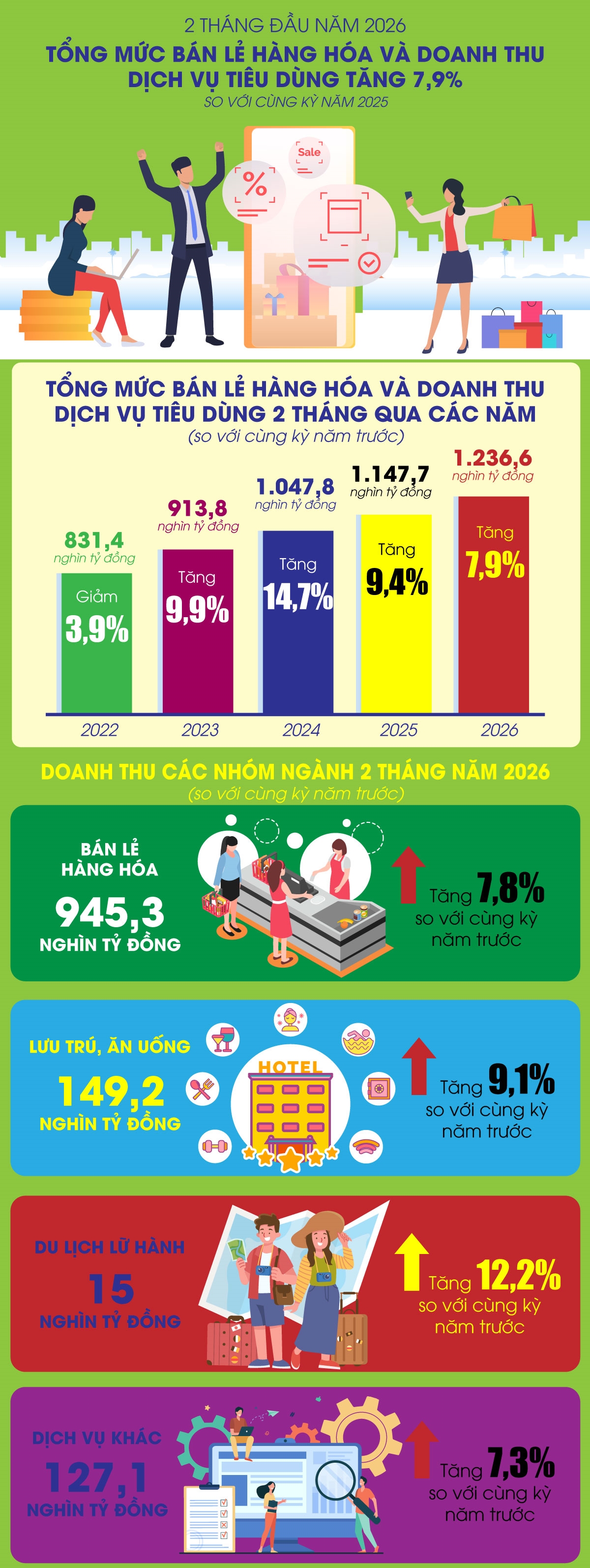 2 tháng đầu năm 2026, tổng mức bán lẻ hàng hóa và doanh thu dịch vụ tiêu dùng theo giá hiện hành ước đạt 1.236,6 nghìn tỷ đồng, tăng 7,9% so với cùng kỳ năm trước. Trong đó, doanh thu bán lẻ hàng hóa tăng 7,8%, doanh thu dịch vụ lưu trú, ăn uống tăng 9,1%, doanh thu du lịch lữ hành tăng 12,2%...