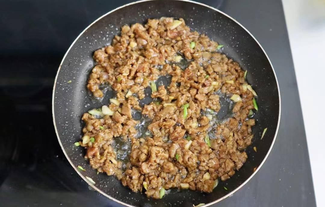 4. Trong lúc chờ, đun nóng chảo với chút dầu, xào thịt băm đến khi chín, thêm hành lá thái nhỏ cho thơm.