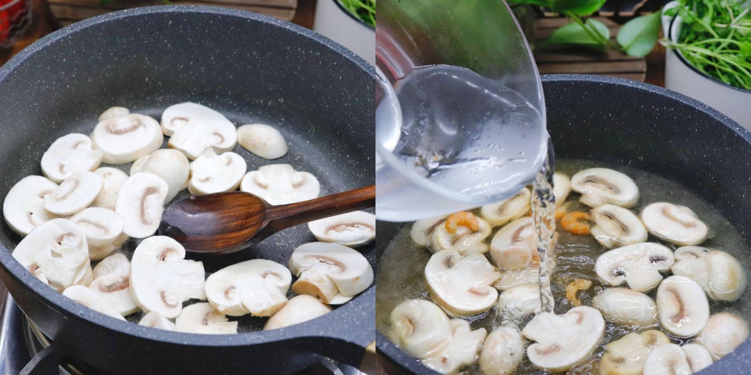 2. Đun nóng chảo với chút dầu, cho nấm vào xào đều tay đến khi nấm mềm và tỏa hương thơm. Nếu thích, thêm tôm khô vào xào cùng để tăng vị umami. Sau đó, đổ nước lọc vào đun sôi.