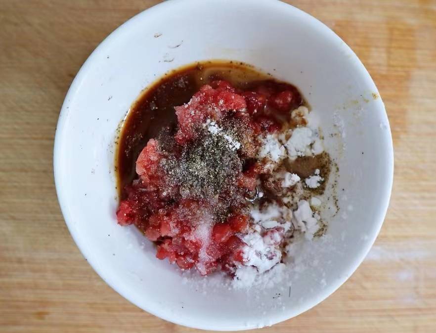2. Thịt băm ướp với nước tương, muối, tiêu và một ít bột bắp, trộn đều để thấm gia vị.