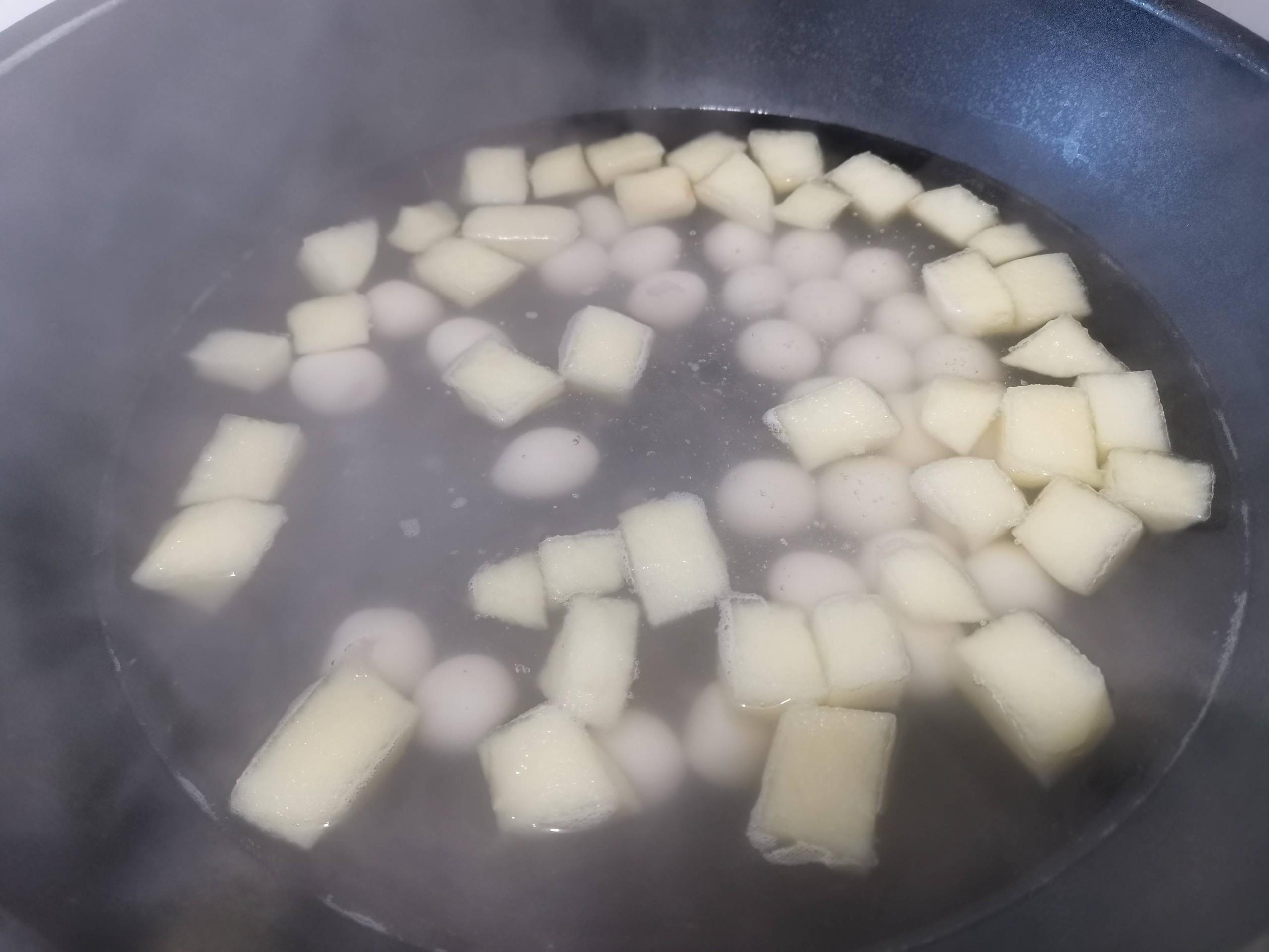 3. Đun sôi nước trong nồi, thả táo vào trước, sau đó cho các viên bánh trôi vào, khuấy nhẹ để tránh dính.