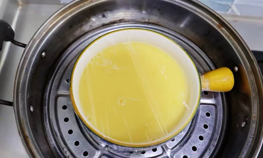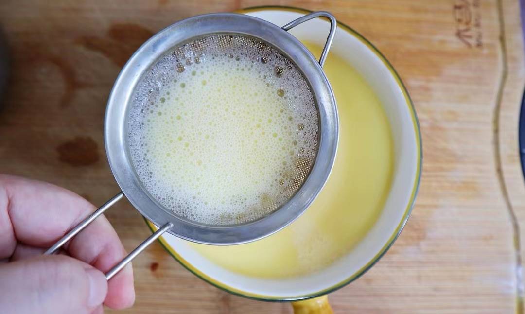 1. Đập 2 quả trứng vào bát, thêm 80ml nước lọc, đánh đều bằng đũa, lọc qua rây để loại bỏ bọt khí.