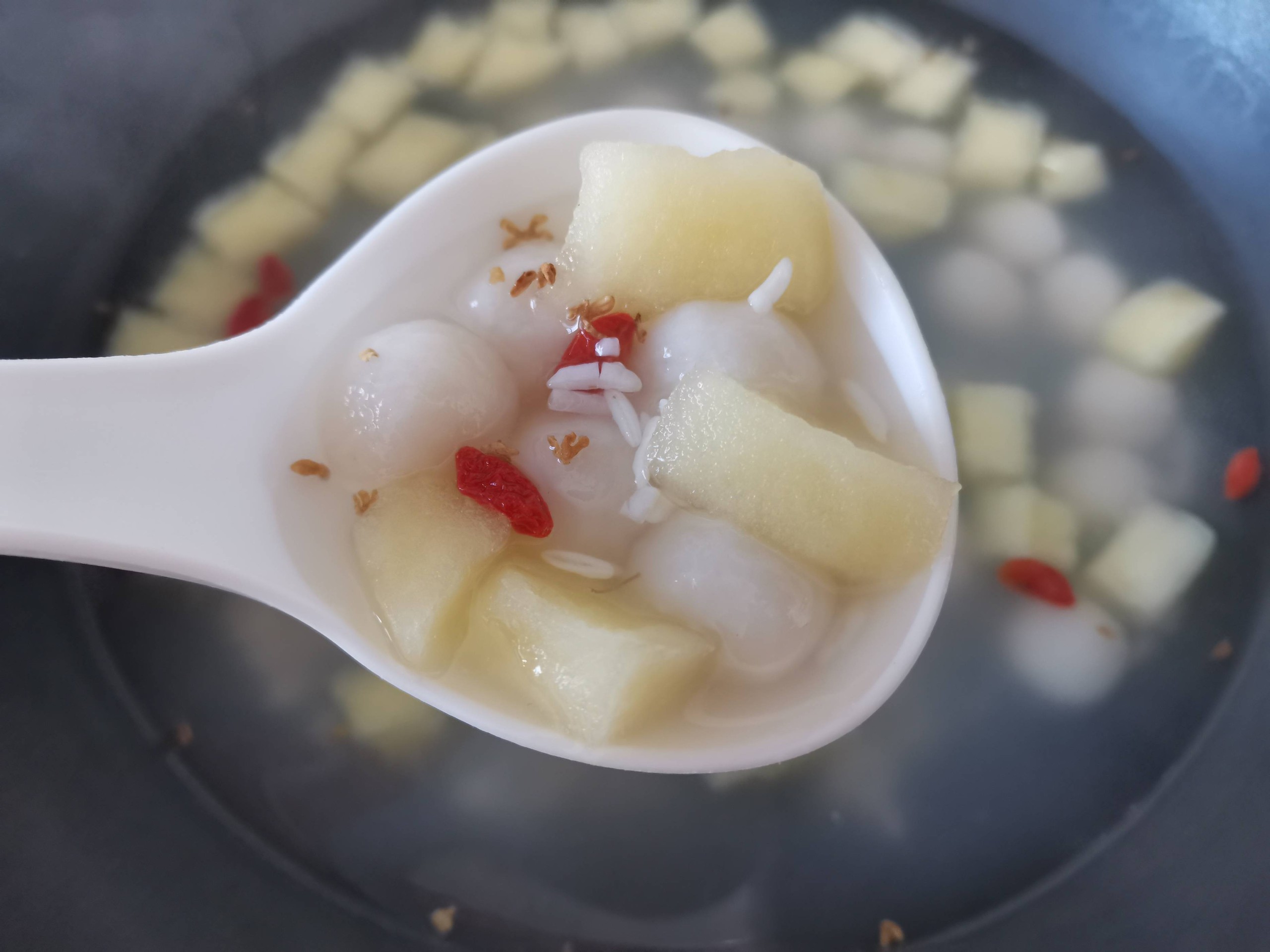 4. Đậy nắp, nấu khoảng 3 phút đến khi bánh nổi lên mặt nước thì thêm kỷ tử, rượu ngọt và hoa quế. Khuấy đều rồi tắt bếp. Thưởng thức ngay khi còn nóng để cảm nhận vị ngọt thanh tao!