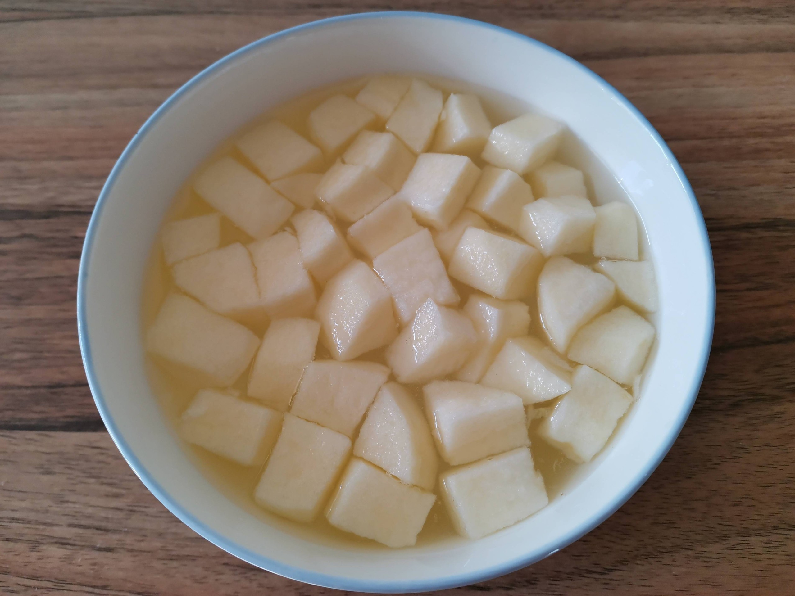2. Táo gọt vỏ, bỏ lõi, thái hạt lựu nhỏ.
