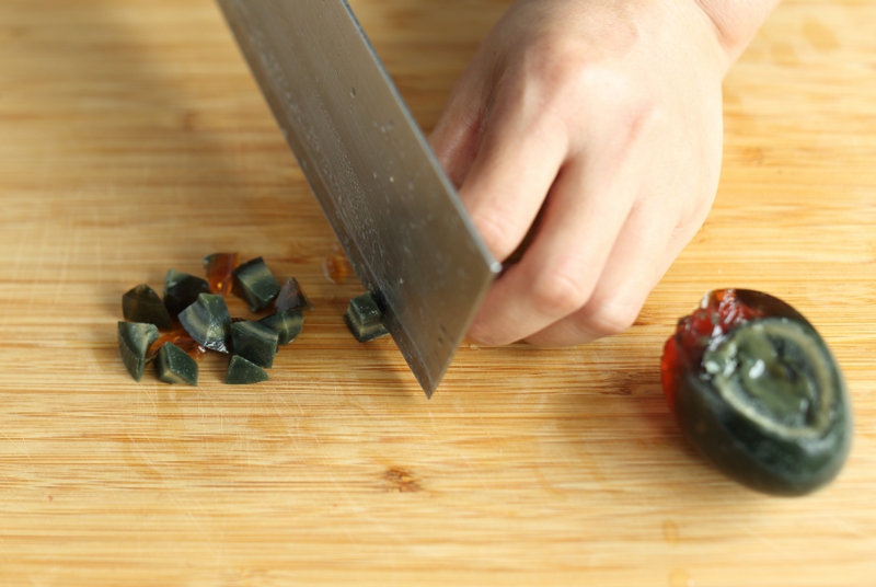 Bước 1: Vo gạo trước rồi ngâm trong nước sạch 15-30 phút để cháo nở đều, mềm mịn hơn. Thịt lợn băm cho vào bát, thêm chút muối và bột tiêu rồi trộn đều, ướp trong khoảng 15 phút. Trứng bắc thảo đem lột vỏ, cắt thành từng miếng nhỏ hoặc lát mỏng, để riêng. Lưu ý nếu cắt trứng bắc thảo quá lớn có thể ảnh hưởng đến hương vị. Tốt nhất nên cắt thành những miếng nhỏ có kích thước phù hợp. Rửa sạch và thái gừng thành lát mỏng để khử mùi tanh cũng như tăng hương vị.