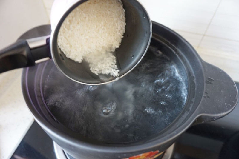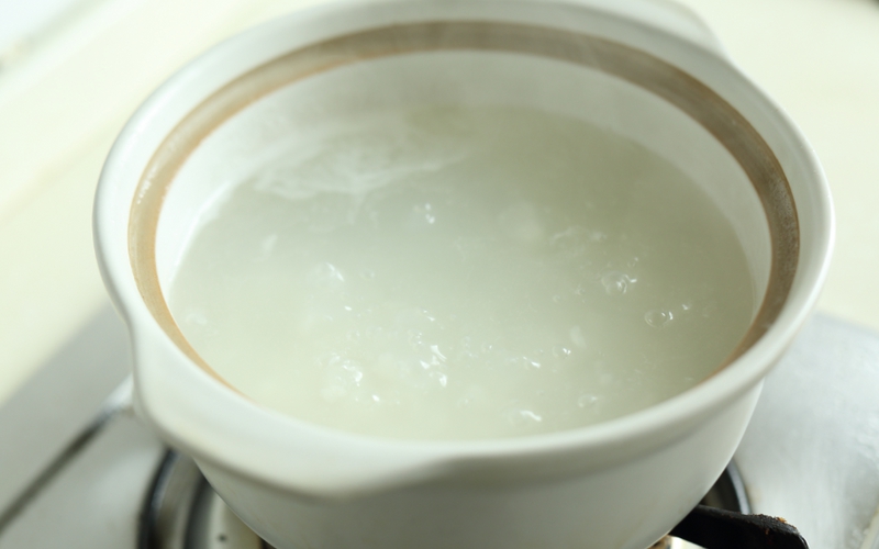 Bước 2: Vo sạch gạo và ngâm trước 20 phút để hạt gạo khi nấu chín sẽ mềm hơn. Cho lượng nước vừa đủ vào nồi, thêm gạo đã ngâm rồi bật bếp đun sôi trên lửa nhỏ, vớt bọt. Bạn ninh cháo ở lửa nhỏ trong khoảng 20 phút, cho đến khi chín mềm.