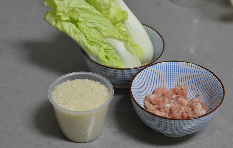 Nguyên liệu: 100g gạo; 100g thịt lợn băm (thịt nạc); một ít rau xanh (như cải thảo, rau bina, v.v...); một ít gừng; một ít muối; 1 thìa canh rượu nấu ăn; một ít tinh chất cốt gà (tùy chọn).