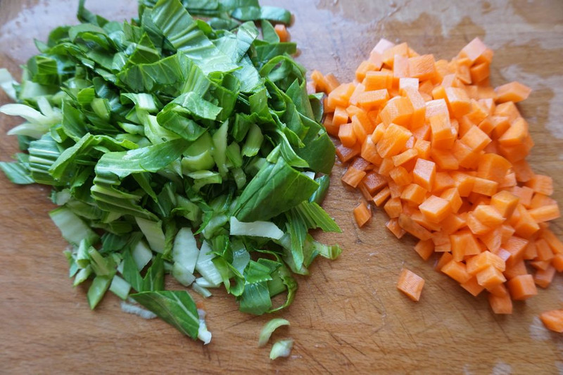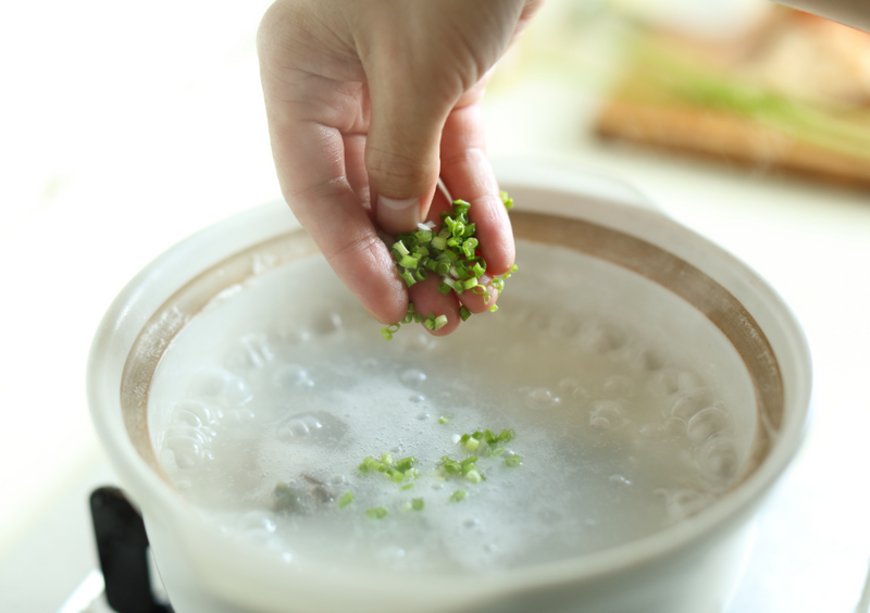 Bước 2: Đổ một lượng nước vừa đủ vào nồi, thêm gạo rồi đun cho đến khi nước sôi. Lúc này bạn có thể hớt bỏ bọt. Chỉnh lửa nhỏ và nấu cháo trong khoảng 30 phút cho đến khi chín mềm. Rửa sạch các loại rau và thái nhỏ.