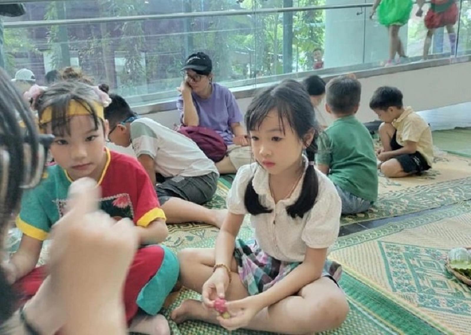 Nghệ nhân tại Bảo tàng Dân tộc học hướng dẫn các em nhỏ chơi trò chơi dân gian nặn đất