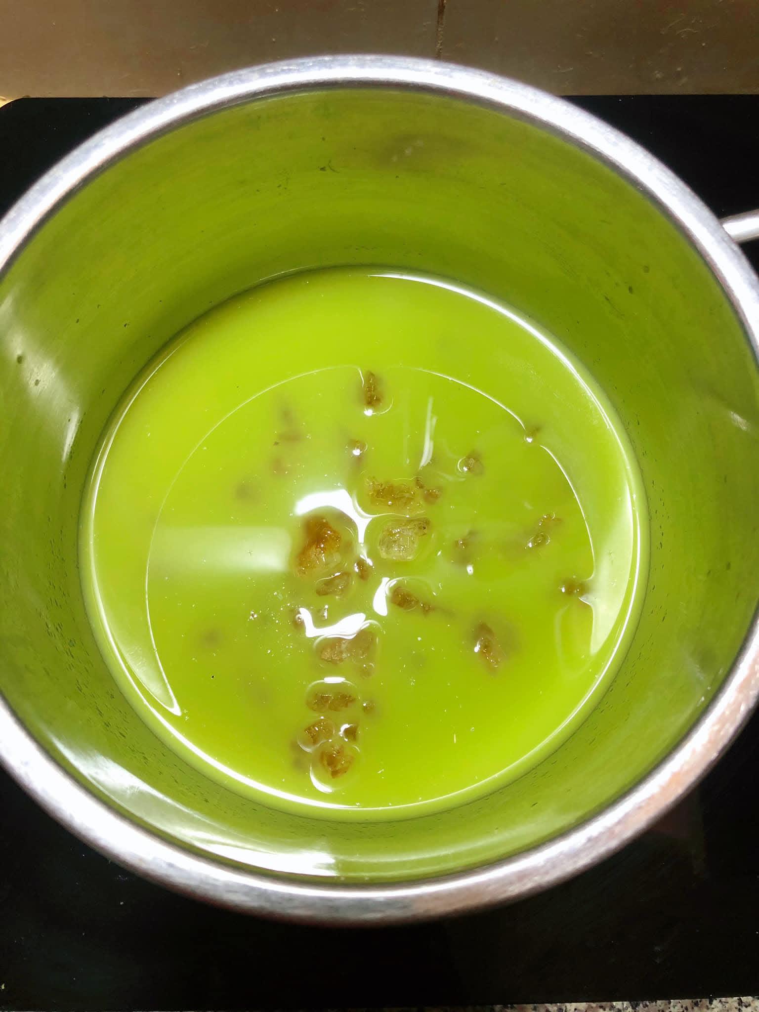- Tiếp theo, cho đường phèn vào chảo nhỏ bật lửa nhỏ nấu cho đường tan ra. Cho cốt đào tiên, cốt chanh vào đường khuấy đều rồi tắt bếp.