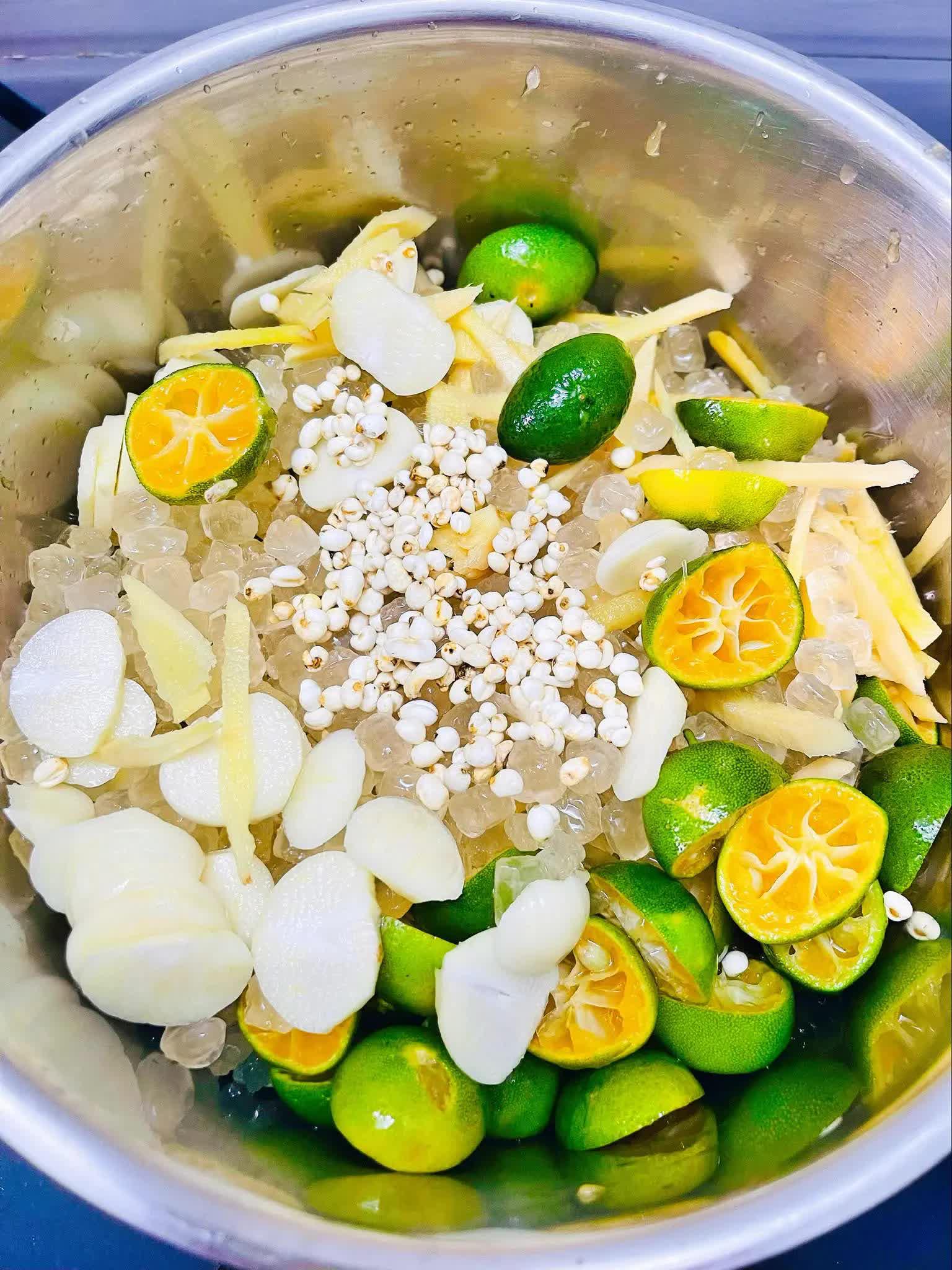 - Cho lá húng chanh thái nhỏ, gừng thái sợi, vỏ tắc, nước quất vào cối cùng 150ml nước lọc rồi xay nhuyễn.