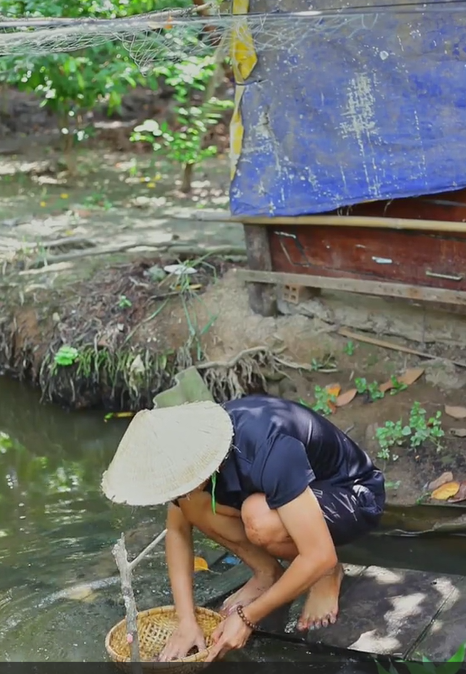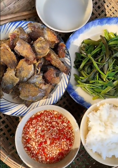 Theo chia sẻ trong clip của chị Kim Nga cho hay: “Ở dưới quê dễ sống lắm, chỉ cần siêng một chút là có đồ ăn rồi, không cần tốn nghìn nào luôn. Bỏ công thì đỡ tốn tiền, mọi người thấy đúng không? Giờ mình bận công việc quá nhiều nên ít có thời gian bắt cá, bắt ốc về ăn. Gần chợ thì có sẵn, chạy ào ra mua là xong. Còn nhà ai có con cá, con vịt thì dễ quá rồi, khỏi cần đi chợ luôn. Rau có sẵn, ra vườn bẻ đọt càng cua, rau muống, rau lang về luộc là xong bữa rồi”.