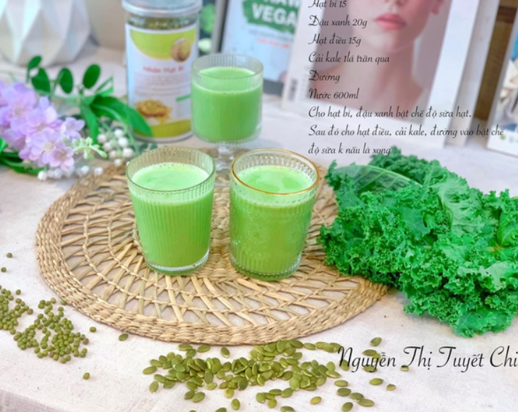 - Cho hạt bí, đậu xanh bật chế độ sữa hạt. Sau đó cho hạt điều, cải kale, đường vào bật chế độ sữa không nấu là xong.