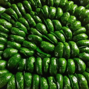 Từng miếng bánh đươc nặn tròn đều, xếp đều tăm tắp, trông như những viên kẹo dẻo khổng lồ ẩn mình trong lớp lá. Một khoanh to như thế mà cô gái tiết lộ chỉ khoảng 20.000 là mua được một gói bánh ngải chất lượng như thế này.