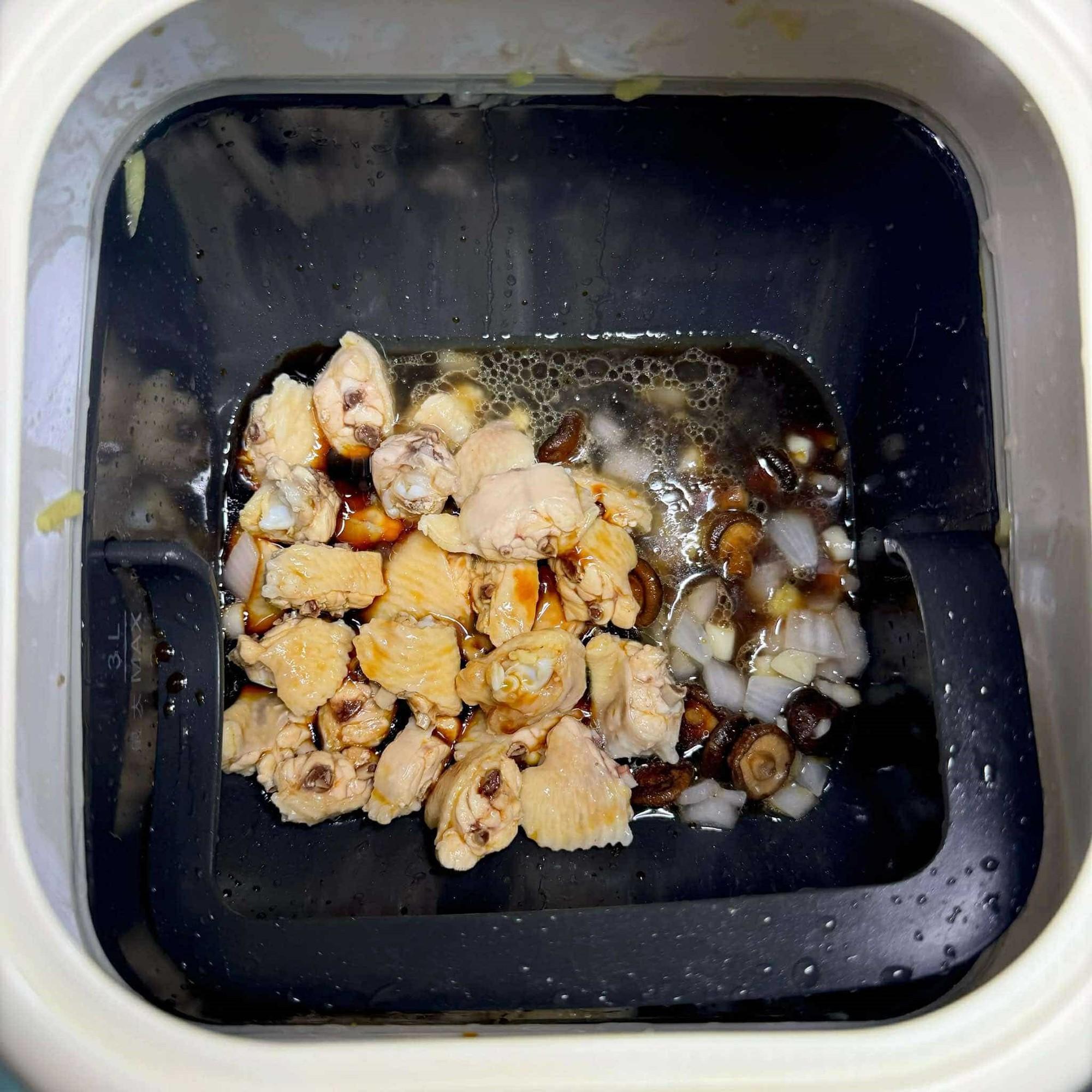 Bước 3: Đun nóng dầu trong nồi, cho gừng, tỏi, hành và nấm hương vào xào đến khi dậy mùi thơm. Tiếp đó cho cánh gà rồi thêm nước sốt gia vị đã chuẩn bị vào, đảo đều một lúc. Sau đó bạn cho thêm khoảng nửa bát con nước (hoặc nước dừa) vào rồi đậy nắp nồi lại, đun nhỏ lửa trong khoảng 10 phút.